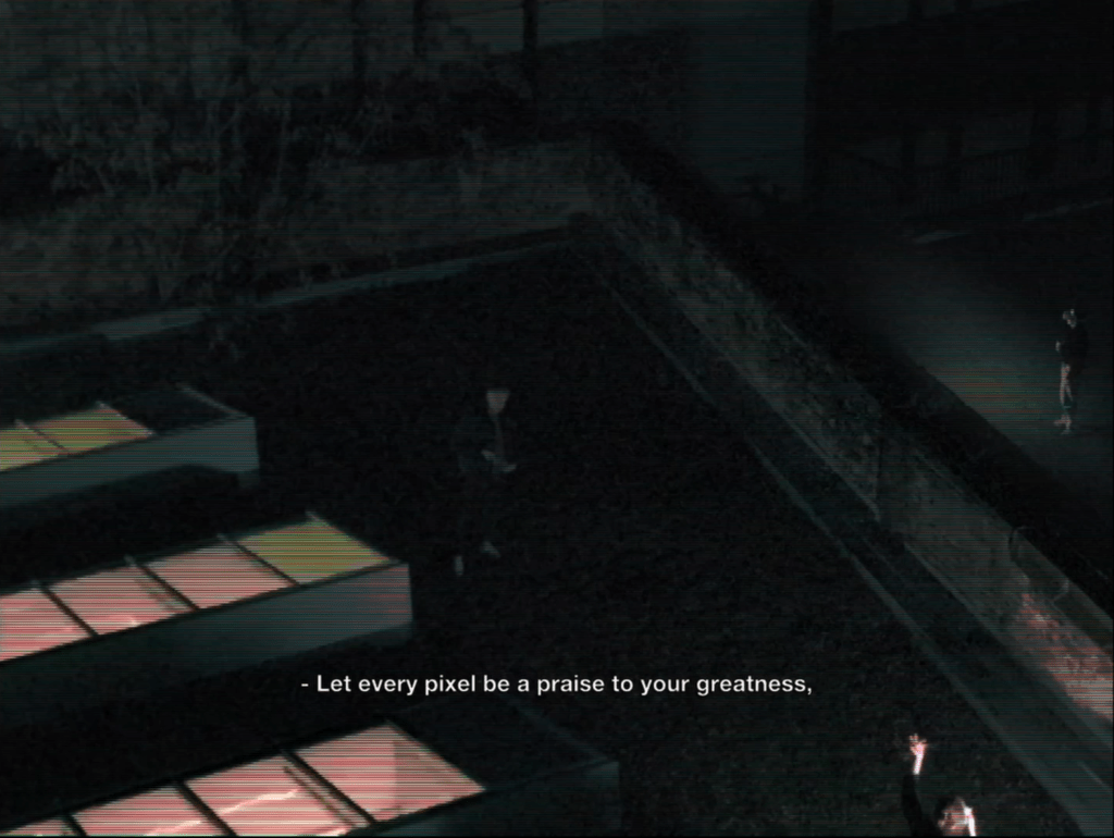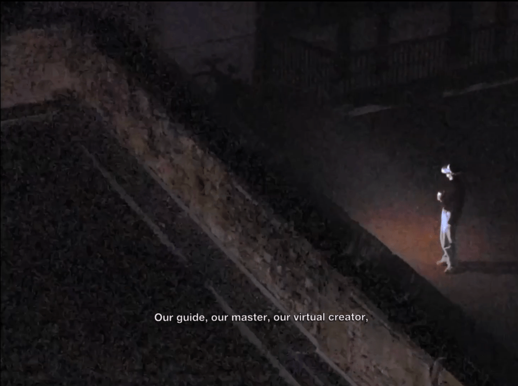 A miniature recitation poem, inspired by the siren’s song from mythology. The text mimics AI language. To the right of the image is a person wearing VR goggles, and the entire image represents what is seen through the goggles—including the person himself.